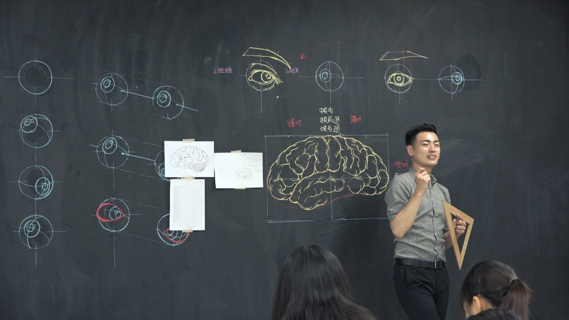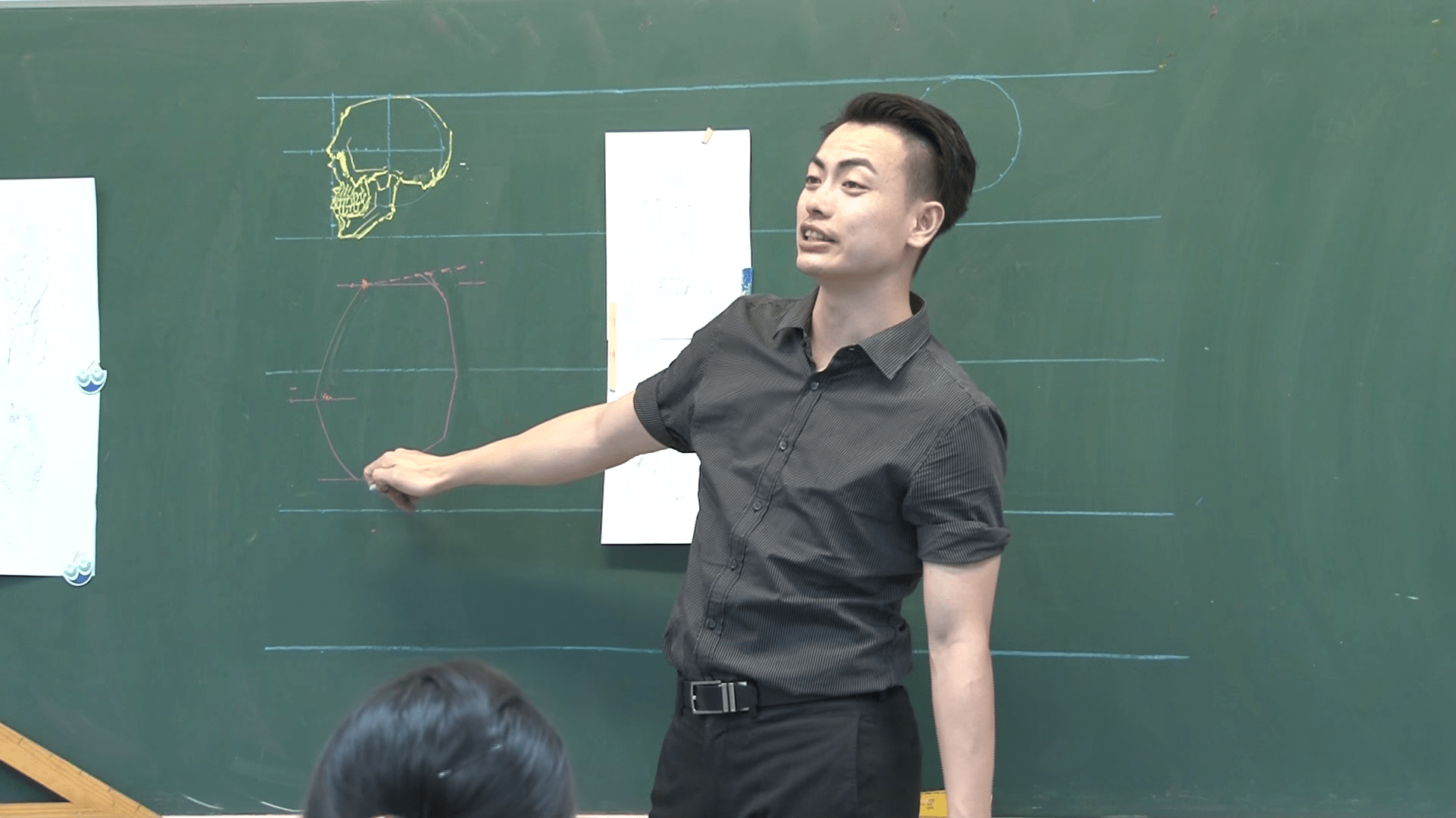 ▼在鍾全斌的課堂上,常可以看到他以輔助線,清楚解釋人體結構與肌理,徒手畫出教科書等級的人體解剖圖。精美的畫作讓人一目了然,很快就可以理解人體各部位的相對位置。