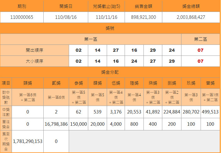 2021年08月17日威力彩第110065期於16日晚開獎,但頭獎依然無人抱回,已經連續40期摃龜。台灣彩券公司預估,下一期威力彩銷售金額能達到12億元,頭獎累積金額上看21.5億元,如果1注獨得,單注獎金為今年最高、第4屆以來第3高。