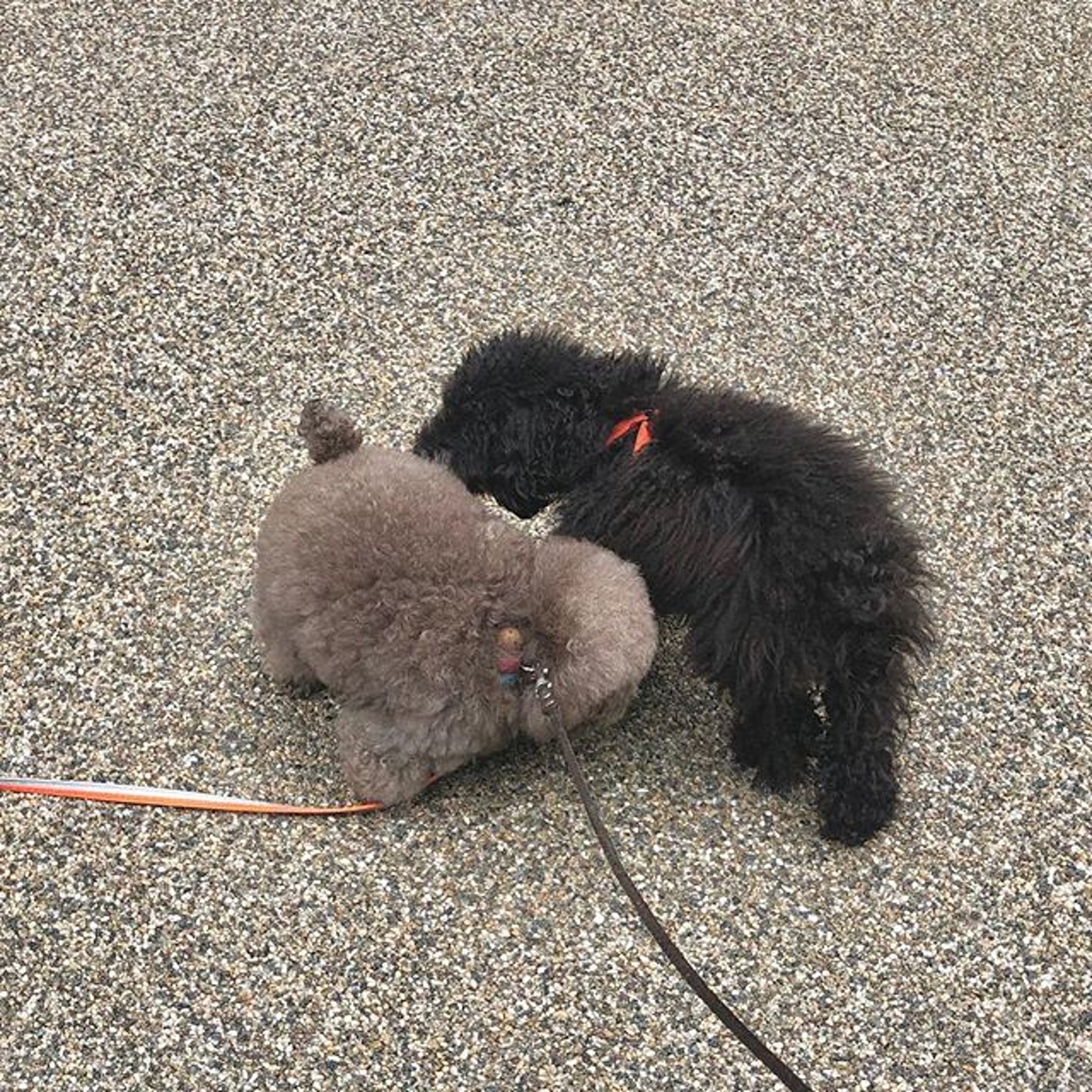 ▼散步的時候遇到別家的狗狗,兩隻玩在一起時就像是兩隻玩具熊一樣~