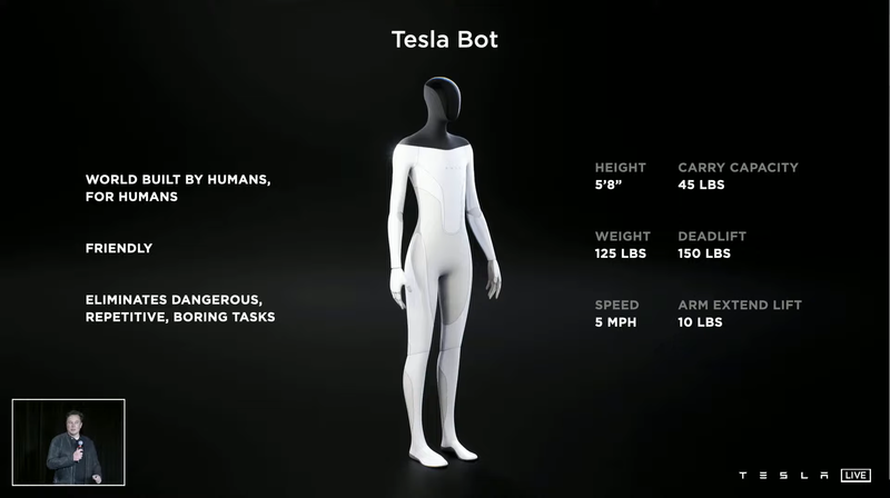 「Tesla Bot」的代號為「Optimus」,主要使用與特斯拉用於自動駕駛技術相同的晶片及感測器。雖然在「人工智慧日」活動上,馬斯克是找來1名演員演示機器人的設計概念,但他強調說「Tesla Bot」會是真正的機器人,明年可能就會推出原型機~