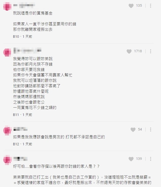 網友們看到後紛紛留言說:「放數位帳戶就沒存摺了」、「我媽也會時不時來問我存款多少,千萬要糊弄過去,如果說朋友要創業寄放呢」、「自己辛苦賺的錢,干他們屁事,要是我就辦個2個帳戶,一個給家人看、一個自己藏著或者搬出去」、「快點把身分證印章貼身藏好,告訴他們,我賺的錢是我的,要拿多少出來給家用也是我可以決定的。另外一個最好的投資,就是買一個一房一廳,快點搬出去吧,把錢變成別的形狀」。大家認為這種情況怎麼辦才好?