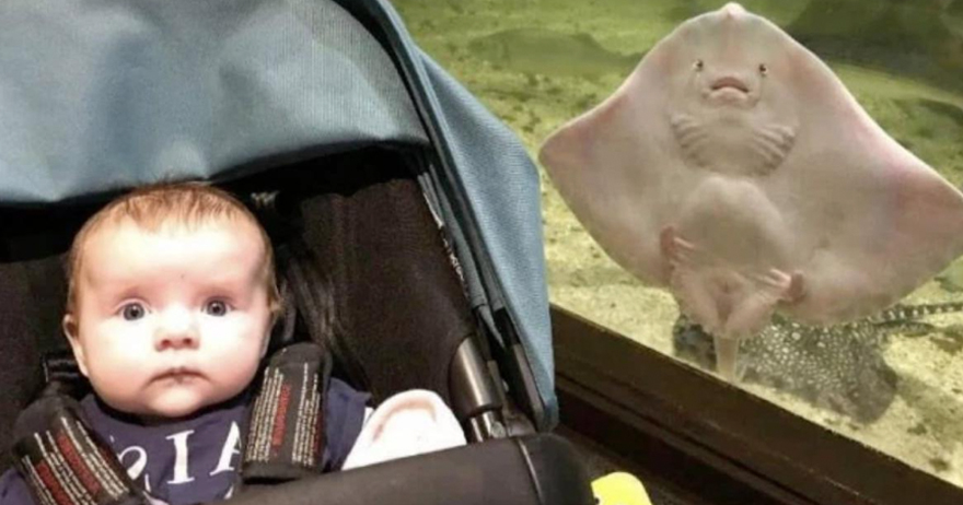 ▼那隻魟魚對坐在嬰兒車裡的Daisy特別感興趣,一直跟在她的身邊。Wendy突然注意到,女兒和魟魚的表情竟然是一樣的!她連忙將這一幕拍下來,笑說:「這是我們最喜歡的照片之一。我拿出手機,想給孩子拍一張照片,正好看到Daisy和魟魚露出同樣的表情。我忍不住哈哈大笑,連忙紀錄下這一瞬間。」