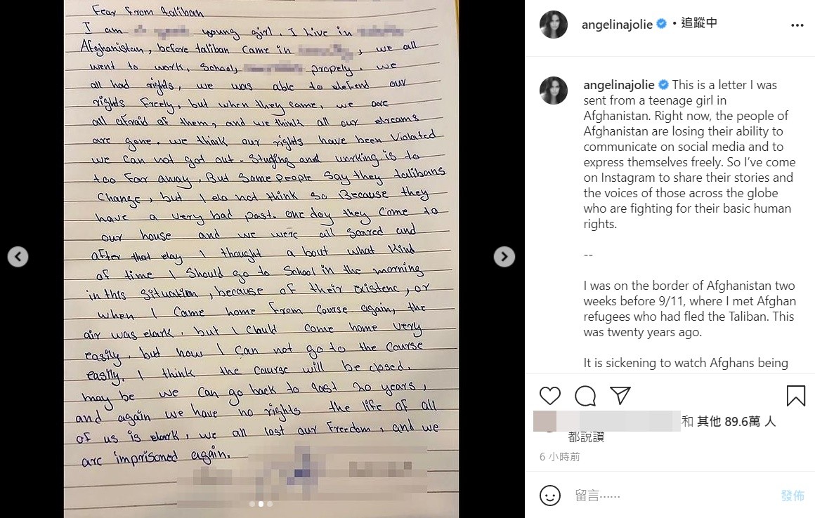 ▼裘莉公開信件前,將少女的名字和位置馬賽克,保護對方的隱私。她透露當年911事件發生前,曾在阿富汗邊境遇到逃離塔利班的難民,如今相隔20年,她再次看到阿富汗人因恐懼和不安而流離失所,不禁感嘆:「真是令人作嘔。」