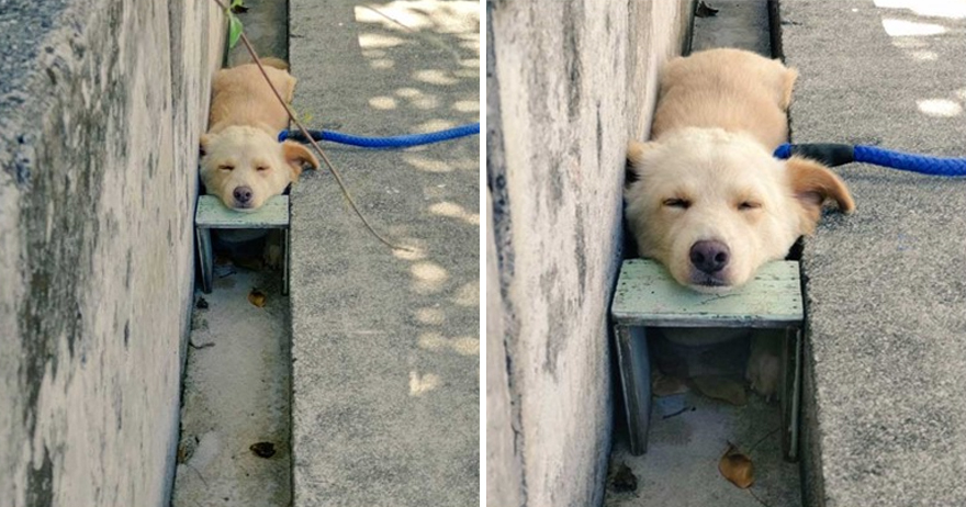 ▼大吉對這條排水溝情有獨鍾,牠經常整隻汪擠成長條塞進去,可能這個狹小的空間讓牠很有安全感。老闆知道大吉的愛好後,貼心地在水溝中放了小木板凳,當成大吉的枕頭。大吉將頭靠在板凳上舒服睡覺的模樣,看起來非常可愛。
