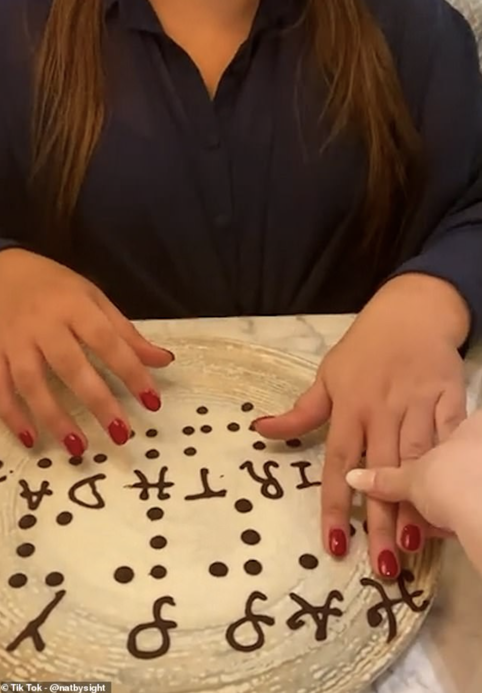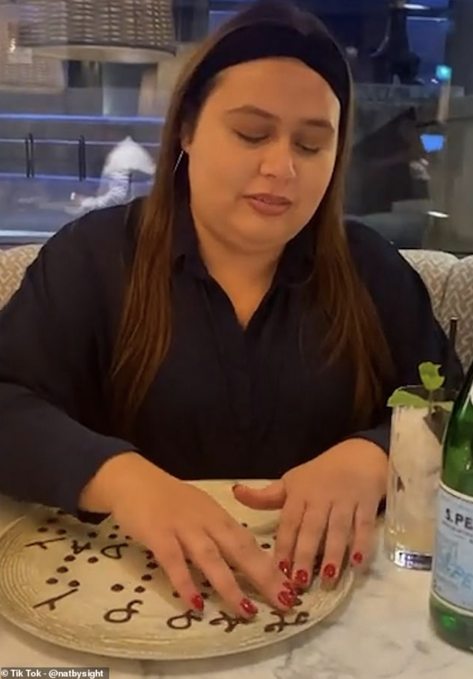 ▼Natalie雙眼都看不見,26歲生日那天,她和朋友一起到倫敦的一間餐廳慶生。用餐時店員一邊說「生日快樂」,一邊將一個盤子擺在Natalie的面前,並引導她用手去摸。Natalie這才知道,盤子上有巧克力做的點字,寫著「生日快樂」。
