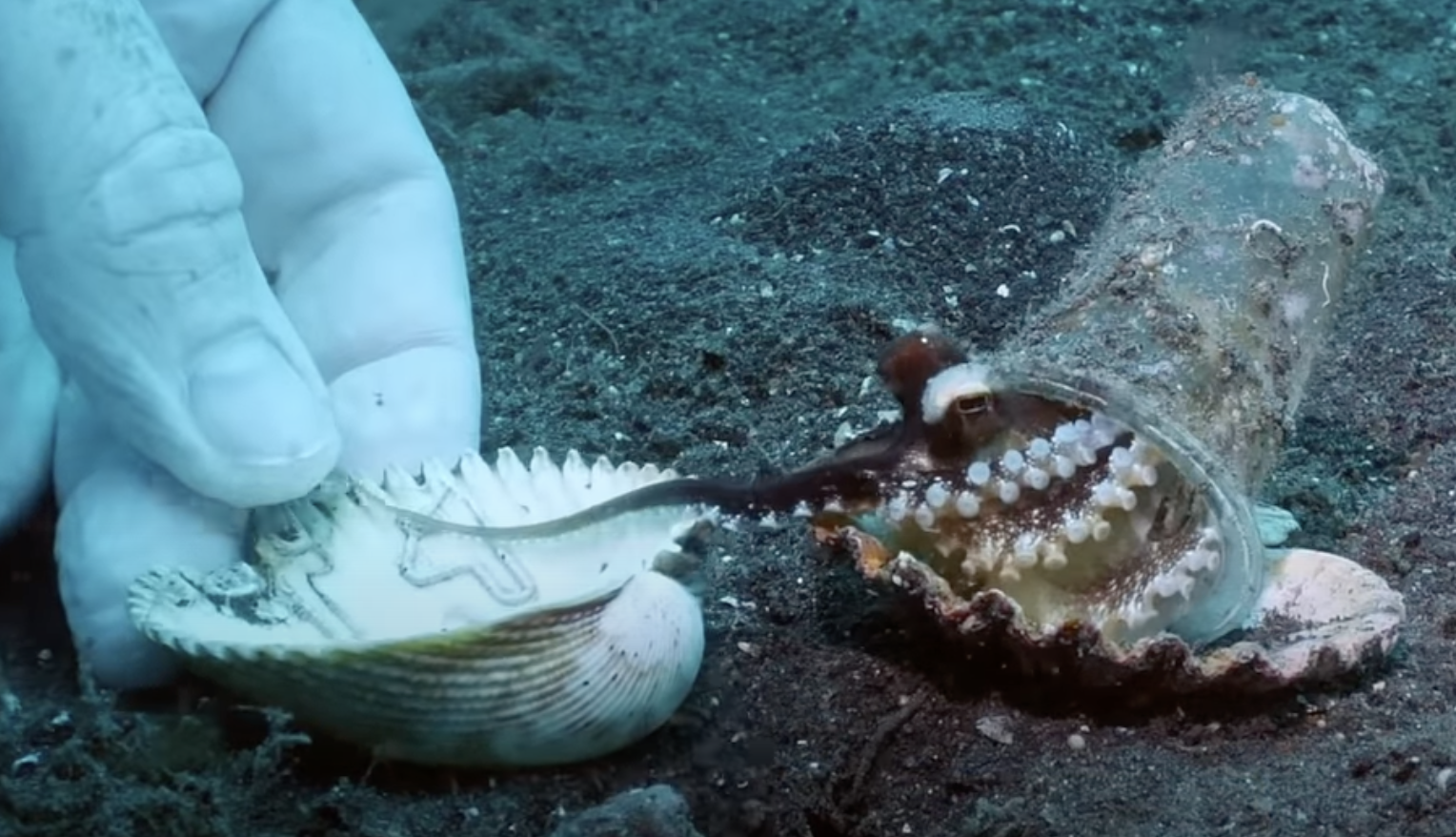 ▼潛水員為章魚寶寶找了好幾個貝殼,希望牠能搬家。章魚寶寶原本不捨得塑膠杯,在潛水員的說服下,才換上貝殼,帶著新家離開: