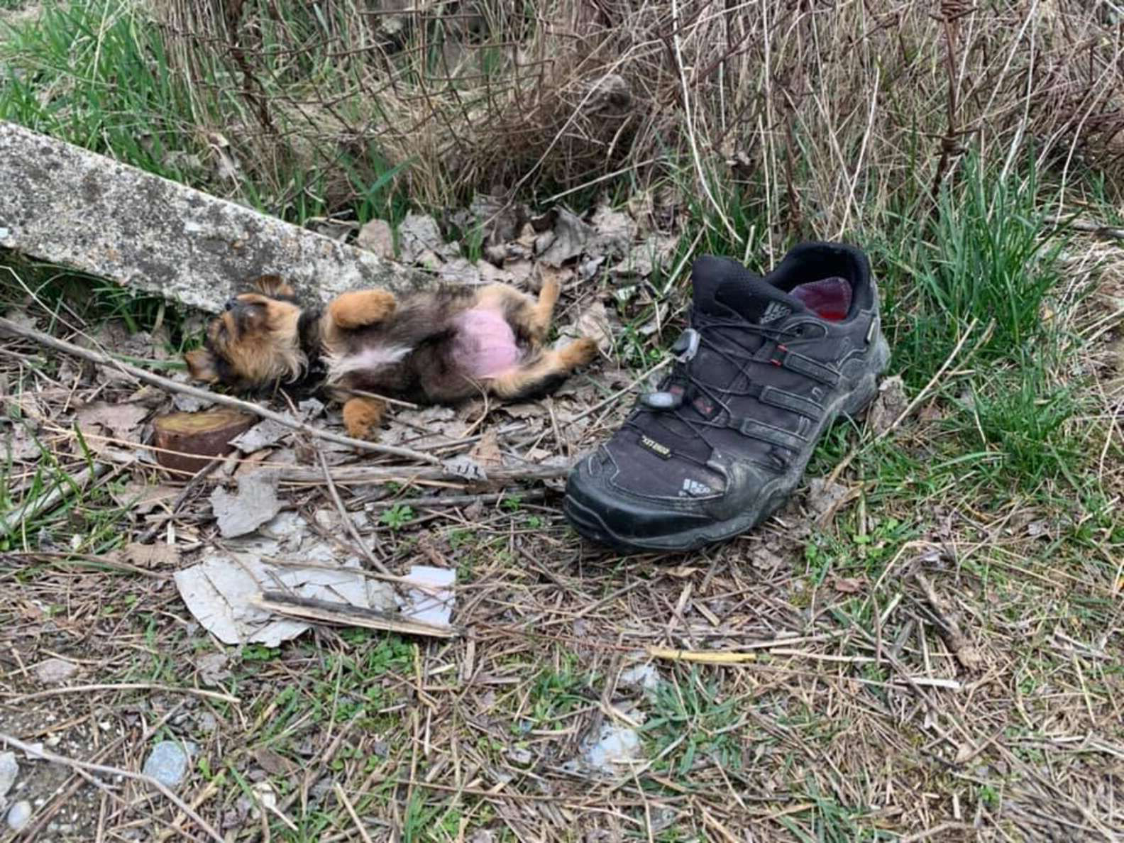 ▼那隻小狗骨瘦如柴,身邊沒有狗媽媽或其他同伴。牠蜷縮在雜草叢中,看來已經餓了好幾天。因為沒有地方遮風擋雨,牠就將一旁的一隻舊鞋當成自己的家。
