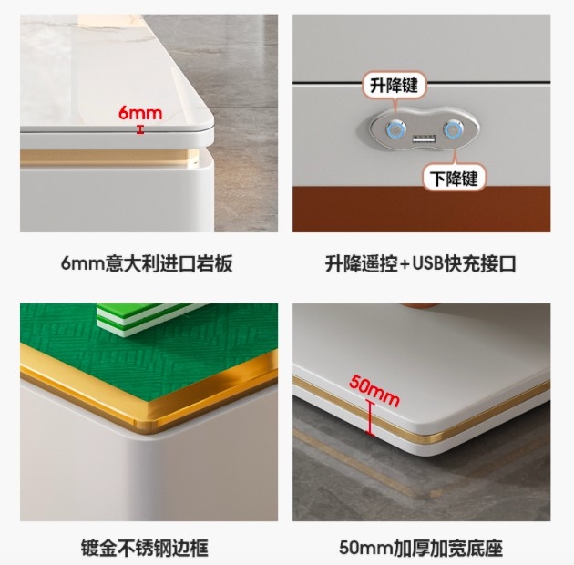 ▼這款「大理石電動麻將桌」最特別的一點就是有智能聲控的功能,只要說出「洗牌」、「我想玩13、16張」等指令,它就能自動洗好。桌子的升降按鈕處有USB充電孔,可以在打麻將的時候給手機充電。麻將桌上的布是加厚植絨檯面,防塵、防水,打理起來更方便。