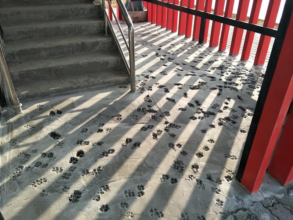 ▼從照片中可以看到,未乾的水泥地上佈滿狗狗的腳印,有些地方腳印非常密集,還有疑似打混的痕跡,可以想像昨晚的情況有多激烈。原po在貼文中說:「昨晚這裡到底是有多熱鬧,有人可以還原真相嗎?早上上班看到臉都綠了。」